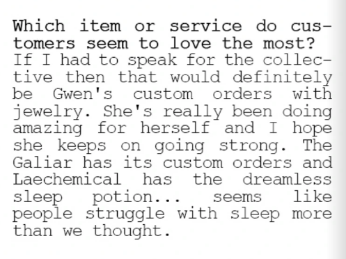 The next few months she was eventually taken in by Galiar Industries, she advanced her learning curve of being a blacksmith into jewelsmithing, seeing the potential and open market, Gwen quickly took the opportunity to seize this moment and expand her own business, with her now late Uncle's property sold, Gwen purchased a store in Mage District and from there Asheford Jewellery came into light.